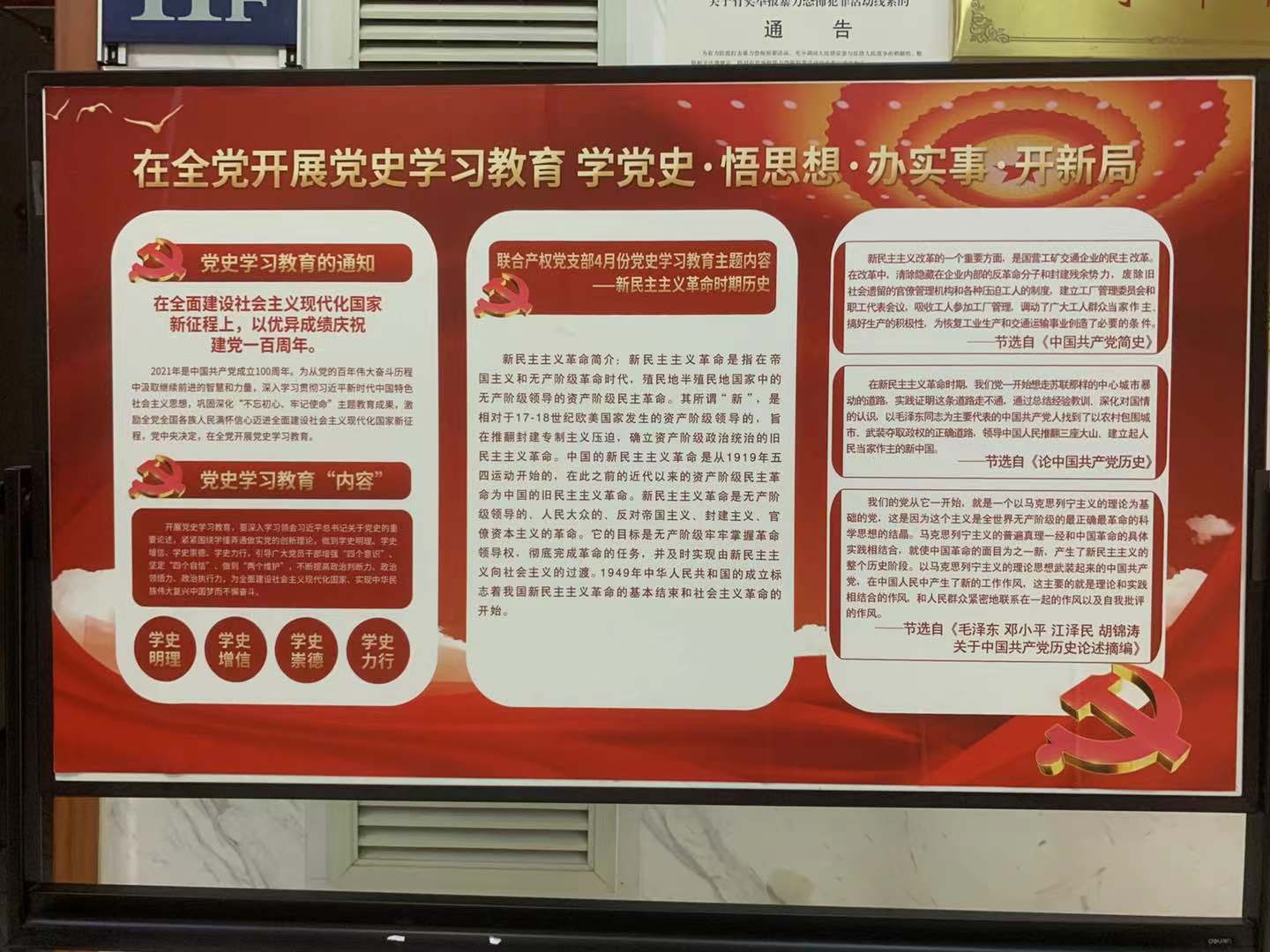 自黨史學(xué)習(xí)教育開展以來,聯(lián)合產(chǎn)權(quán)黨支部通過制定學(xué)習(xí)計劃、制作月度學(xué)習(xí)宣傳欄、組織黨員定期學(xué)習(xí)討論等方式持續(xù)推進學(xué)習(xí)教育工作。下一步,聯(lián)合產(chǎn)權(quán)黨支部將繼續(xù)深入開展黨史學(xué)習(xí)教育主題活動,切實把黨史學(xué)習(xí)教育與總結(jié)經(jīng)驗、觀照現(xiàn)實、推動工作結(jié)合起來,切實做到學(xué)黨史、悟思想、辦實事、開新局,鍛造“不折不扣、不偏不倚”的政治執(zhí)行力,以優(yōu)異成績迎接建黨一百周年。