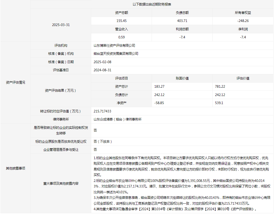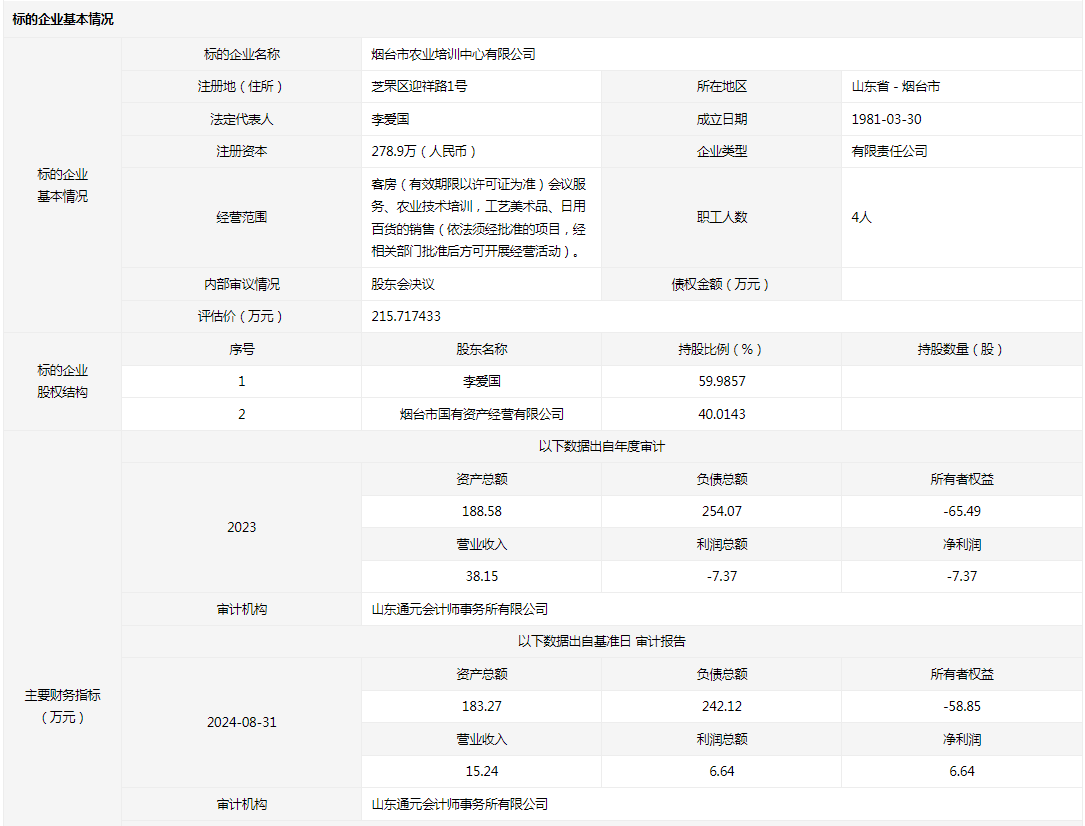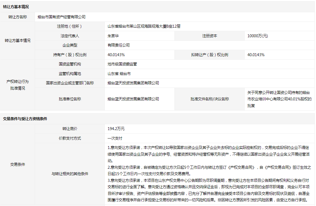 煙臺(tái)市農(nóng)業(yè)培訓(xùn)中心有限公司40.0143%國(guó)有股權(quán)