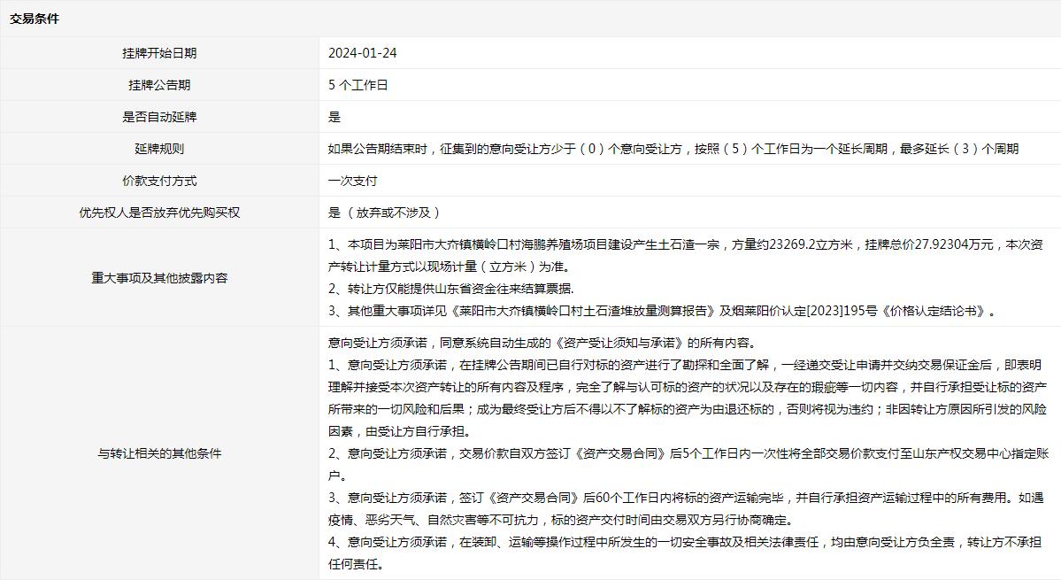 海陽市辛安鎮(zhèn)卓格莊村CX項目平整土地產(chǎn)生部分渣土一宗(3號標(biāo)的)交易公告