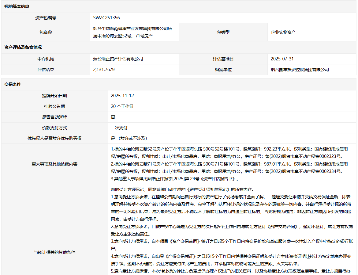 轉(zhuǎn)讓方:煙臺生物醫(yī)藥健康產(chǎn)業(yè)發(fā)展集團有限公司