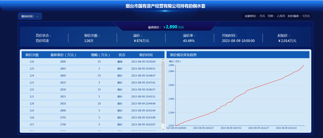 8月9日,煙臺市國有資產(chǎn)經(jīng)營有限公司持有的銅水套項目通過網(wǎng)絡(luò)競價的方式公開競價,18名意向受讓方經(jīng)過126次激烈競價,最終以2890萬元的價格成交,溢價876萬元,溢價率43.49%。